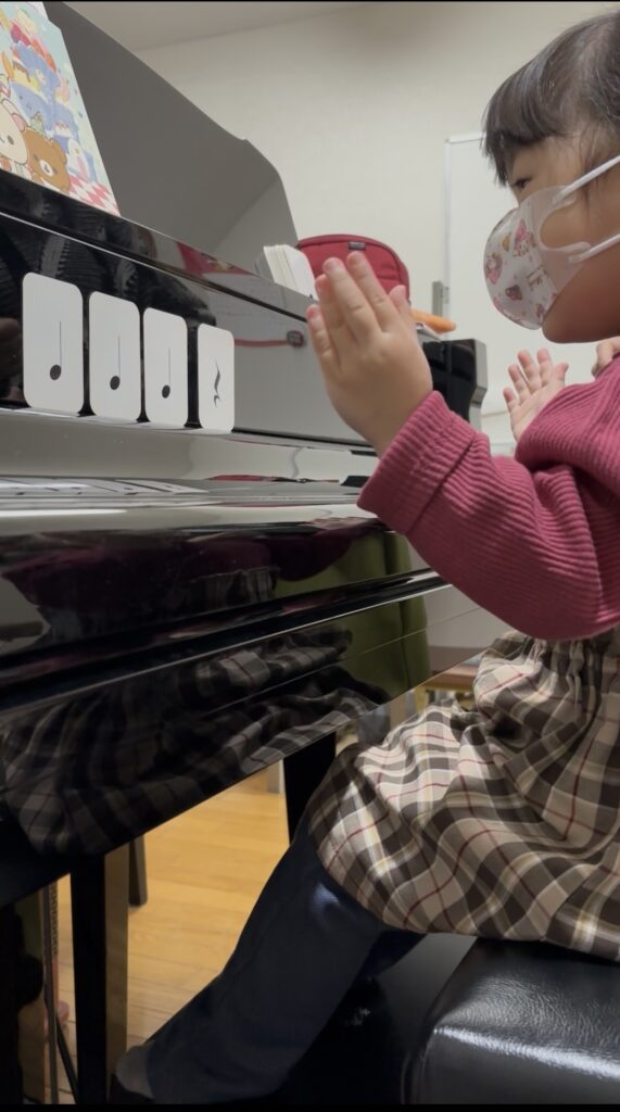 譜面台は高すぎて見にくいだろうなと思い、いつもは私が机の上やピアノの蓋の上に並べていたのですが、今日は生徒ちゃんにカードを渡したんです。